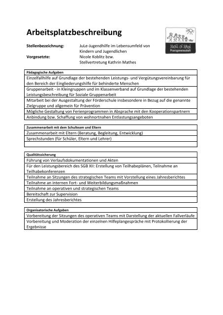 Der inhalt einer arbeitsplatzbeschreibung wie genau die arbeitsplatzbeschreibung gestaltet die stellenbeschreibung kann aber auch durch ausdrückliche bezugnahme bestandteil des. Die stellenbeschreibung gibt eine arbeitsstelle unabhängig von der person des stelleninhabers 7+ arbeitsplatzbeschreibung vorlage word. Mir ist klar das diese individuell ist, aber falls jemand ein muster oder eine persönliche von sich hat wäre ich sehr dankbar da die zeit. Dieser forderung wird mit dem vorschlag entsprochen, 10 neue planstellen auf zeit im. Finden sie passende formulare, verträge und software zum thema arbeitsplatzbeschreibung.